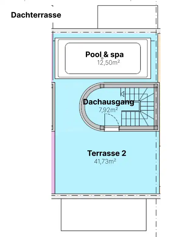 Was R2 wirklich hervorhebt, ist ihr privater Swim-Spa auf der Dachterrasse (12,50 m²) und die panoramische Terrasse (41,73 m²) — ein seltenes Luxusmerkmal, das den Alltag in ein Fünf-Sterne-Erlebnis verwandelt. Ob beim Entspannen im Swim-Spa unter dem Sternenhimmel oder beim morgendlichen Kaffee mit Blick auf die ruhige Umgebung — die Dachterrasse wird zu einem persönlichen Rückzugsort für Erholung und Genuss.
